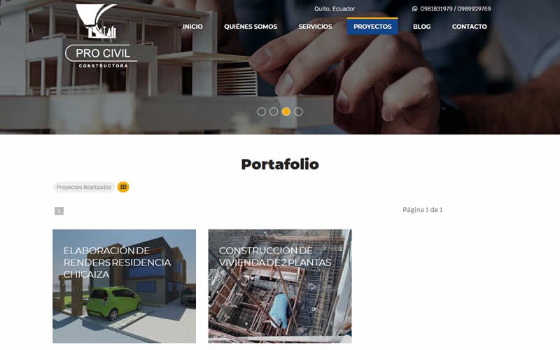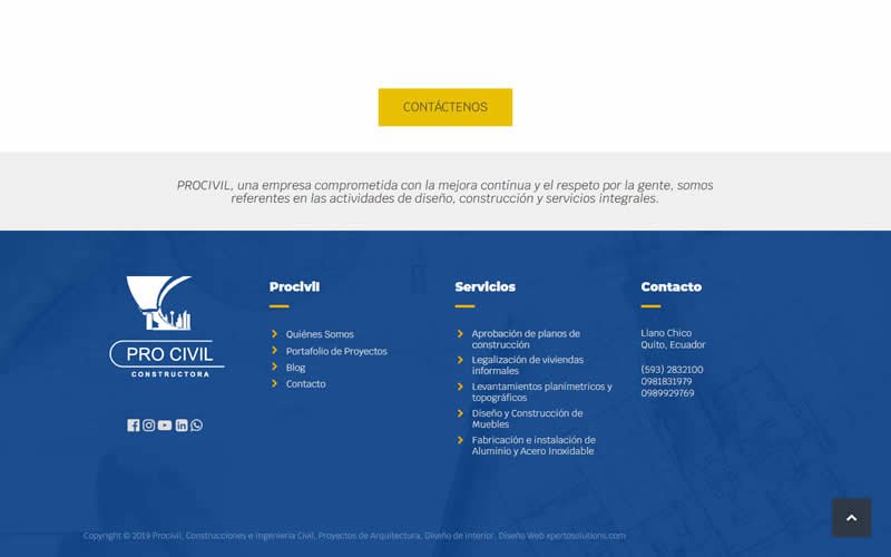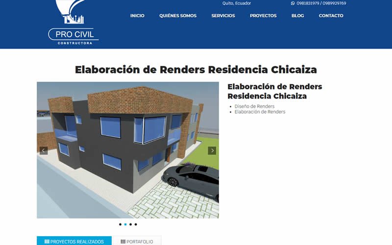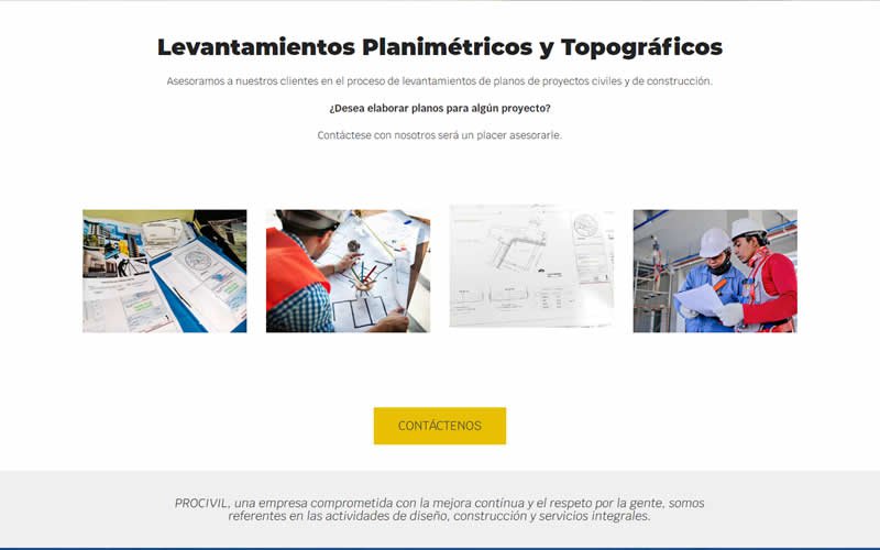 Descripción: Diseño, desarrollo de un Sitio Web con catálogo de Servicios de Construcción, Mantenimiento y Arquitectura para la empresa PROCIVIL CONSTRUCTORA. Empresa Ecuatoriana dedicada a la construcción, Mantenimientos, Aprobación de Planos, Levantammientos Planimétricos y Topográficos, Fabricación y construcción de Muebles, Fabricación en Acero inoxidable y aluminio.
