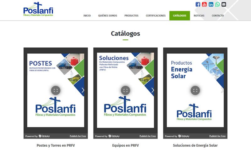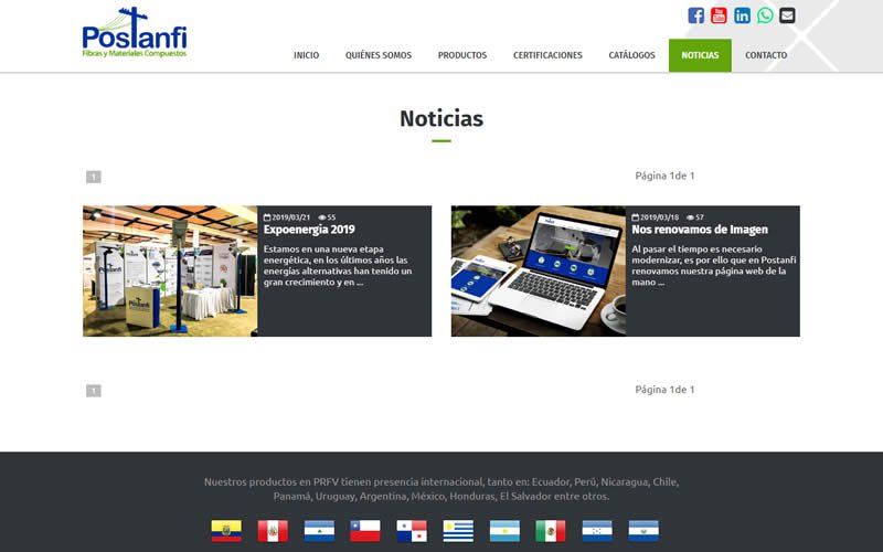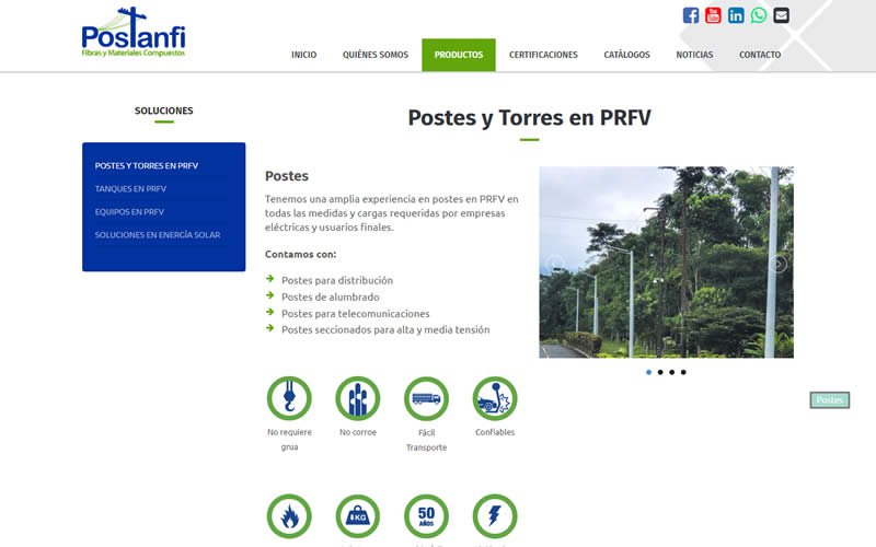 Descripción: Diseño y Desarrollo de un Sitio Web con catálogo de Productos para la empresa POSTANFI FIBRAS Y MATERIALES COMPUESTOS S.A. empresa con presencia en Ecuador, Perú, Nicaragua, Chile, Panamá, Uruguay, Argentina, México, Honduras, El Salvador. POSTANFI S.A es una empresa comprometida con la fabricación de equipos, tanques y postes, en poliéster reforzado en fibra de vidrio (P.R.F.V.) e iluminación solar, cumpliendo normas de calidad nacionales e internacionales.