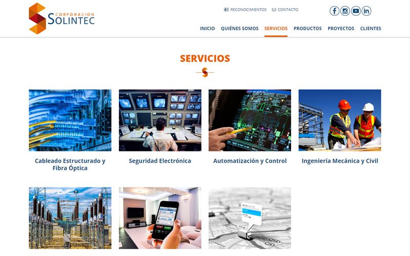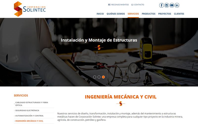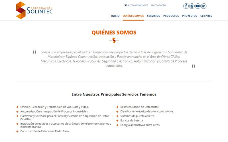Descripción: Desarrollo de sitio web de CORPORACIÓN SOLINTEC empresa especializada en la ejecución de proyectos desde la fase de Ingenierías, Suministro de Materiales y Equipos, Construcción, Instalación y Puesta en Marcha en el área de Obras Civiles, Mecánicas, Eléctricas, Telecomunicaciones, Seguridad Electrónica, Automatización y Control de Procesos Industriales.
