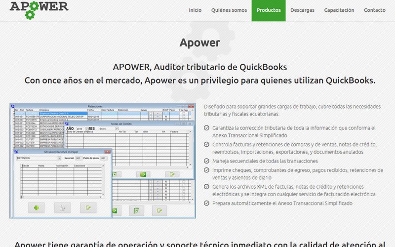Descripción: Diseño y desarrollo del sitio web corporativo de la aplicación APOWER, solución de Facturación electrónica, Administración Contable y Financiera para Quickbooks, reportes, SRI. Con la Legislación Ecuatoriana.