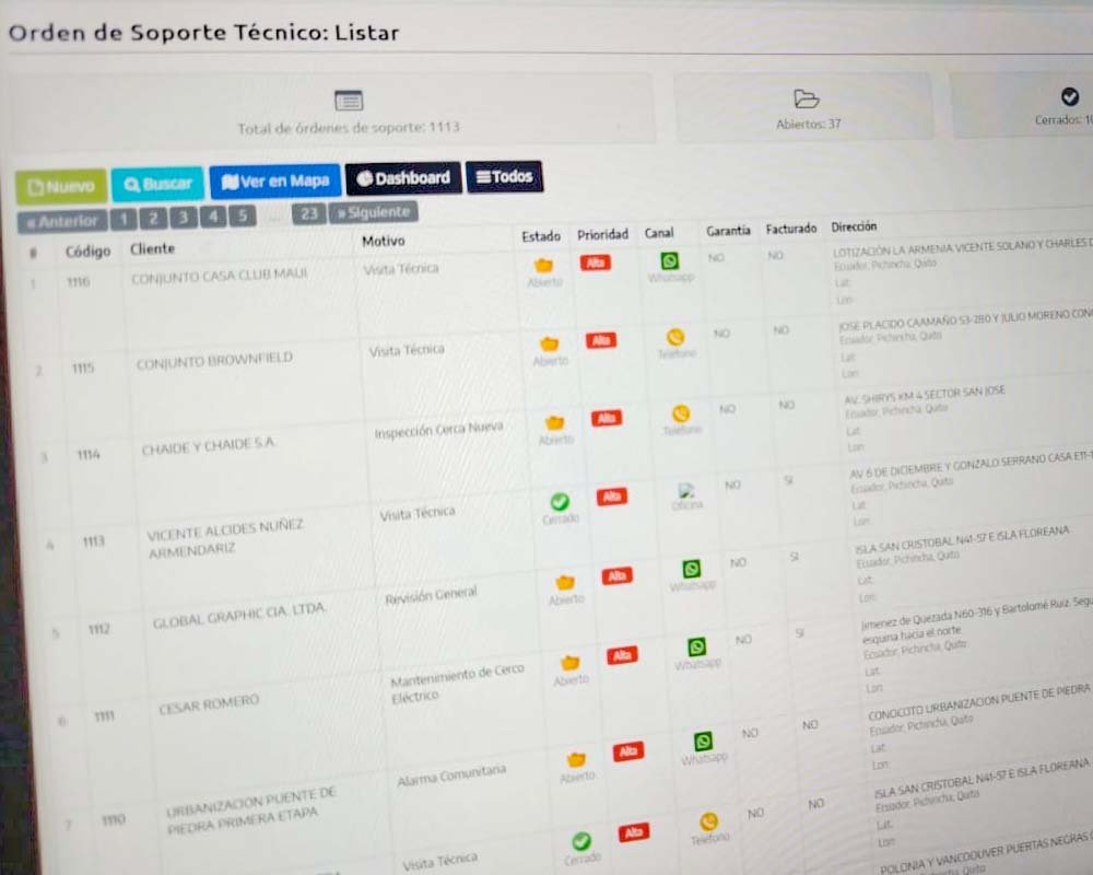 El sistema permite administrar de manera eficiente cada solicitud mediante la asignación de estados de seguimiento a los tickets, facilitando el monitoreo del progreso de cada caso. Además, incluye la generación de órdenes de soporte, visualización georreferenciada en mapas para una mejor planificación operativa y la creación de recordatorios automáticos de mantenimiento preventivo.