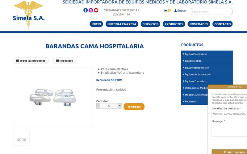 Descripción: Diseño, desarrollo de un Catálogo de Productos de Simela Importadora de Equipos Médicos. Carrito de Compras. Ecommerce.