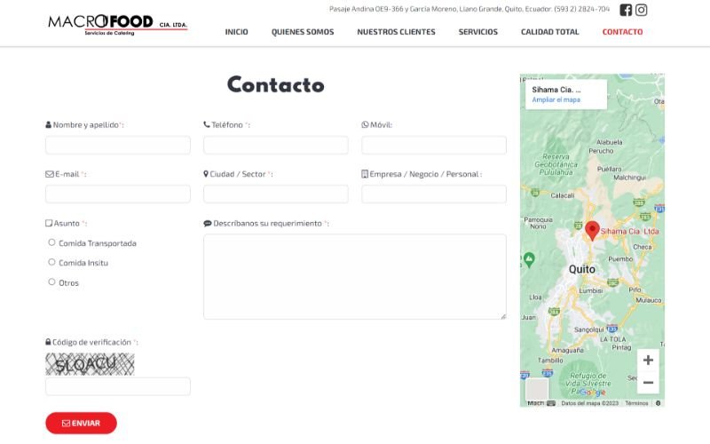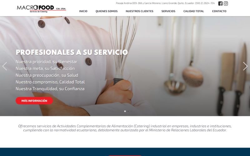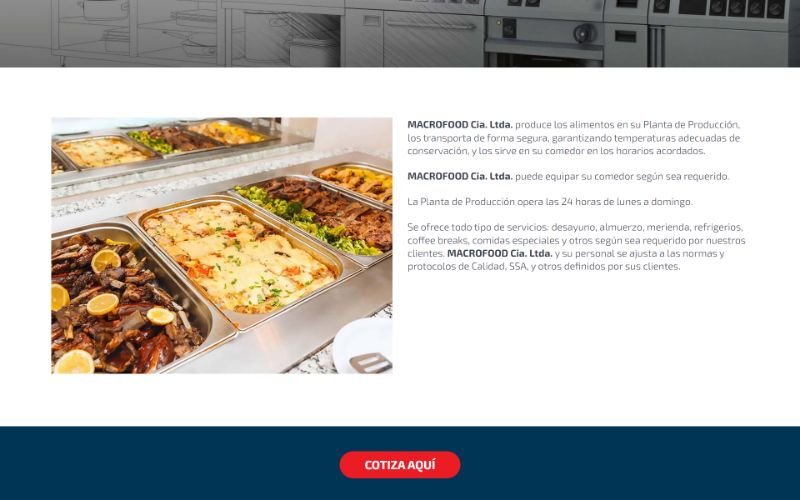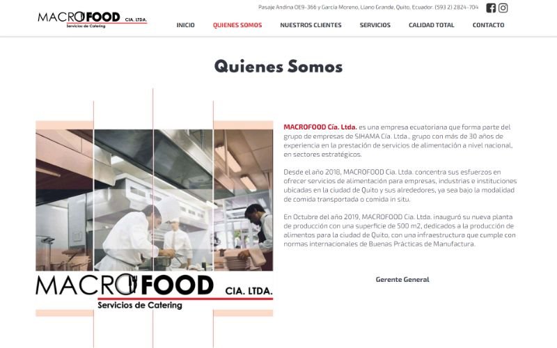 Descripción: Diseño, desarrollo de un Sitio Web de Servicios de Catering para MACROFOOD CIA. LTDA es una empresa ecuatoriana que forma parte del grupo de empresas de SIHAMA Cía, esta ubicado en la ciudad de Quito, desarrollamos una página web para mostrar los servicios que ofrece a sus clientes en la prestación de servicios de alimentación a nivel nacional, en sectores estratégicos.