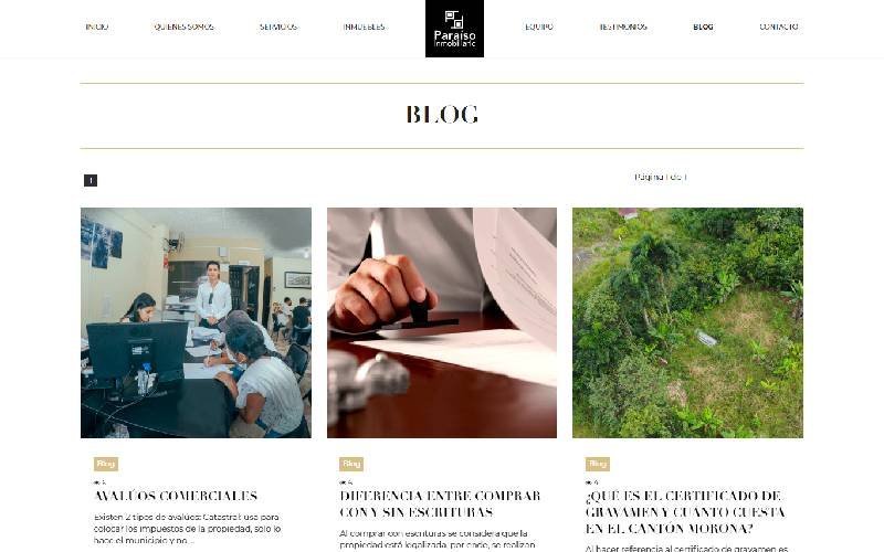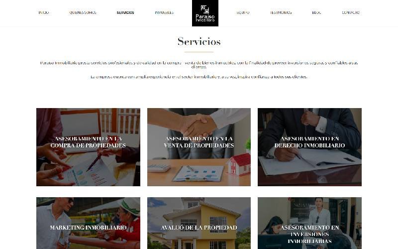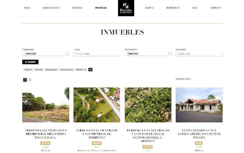 Descripción: Diseño, desarrollo de un Sitio Web de Servicios Inmuebles para PARAISO INMOBILIARIO. Paraiso Inmobiliario es una empresa ecuatoriana ubicada en Macas, provincia de Morona Santiago, empresa dedicada a la compra y venta de Inmuebles, Asesoramiento en Inversiones Inmobiliarias, Avalúos de Propiedades, con la finalidad de proveer inversiones seguras y confiables a sus clientes.