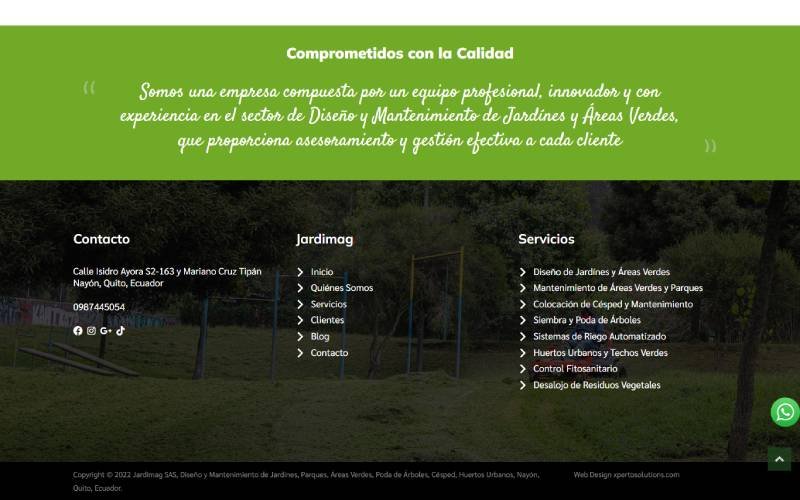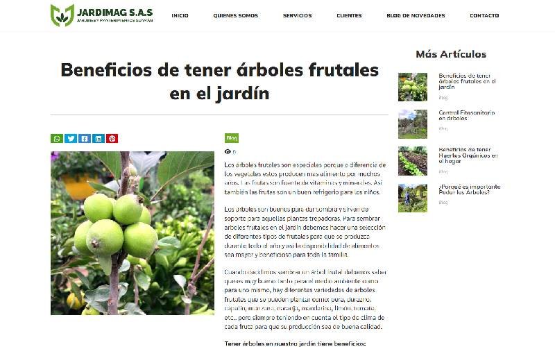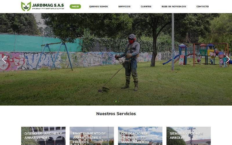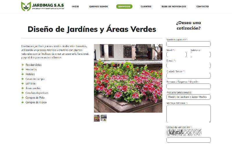 Descripción: Diseño, desarrollo de un Sitio Web de Servicios de Jardinería y Mantenimiento de Áreas Verdes para JARDIMAG S.A.S, es una empresa compuesta por un equipo profesional y con experiencia en los sectores de Diseño, Mantenimiento de Jardínes, Áreas Verdes y Servicios Complementarios, Huertos Orgánicos, y asesoramiento y gestión efectiva a cada cliente.