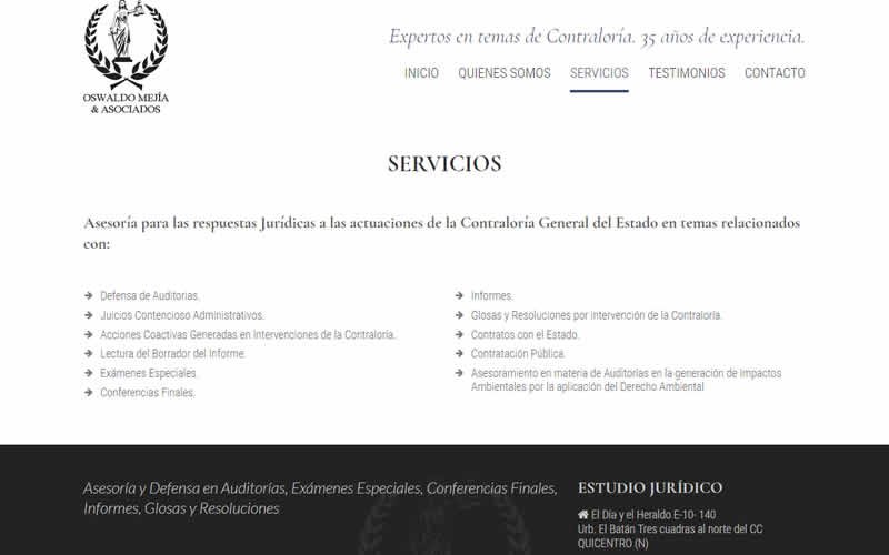Descripción: Desarrollo de sitio web de OSWALDO MEJÍA & ASOCIADOS empresa especializada en Asesoría y Defensa en Auditorías, Exámenes Especiales, Conferencias Finales, Informes, Glosas y Resoluciones, Expertos en desvanecer jurídicamente las decisiones de la Contraloría General del Estado.